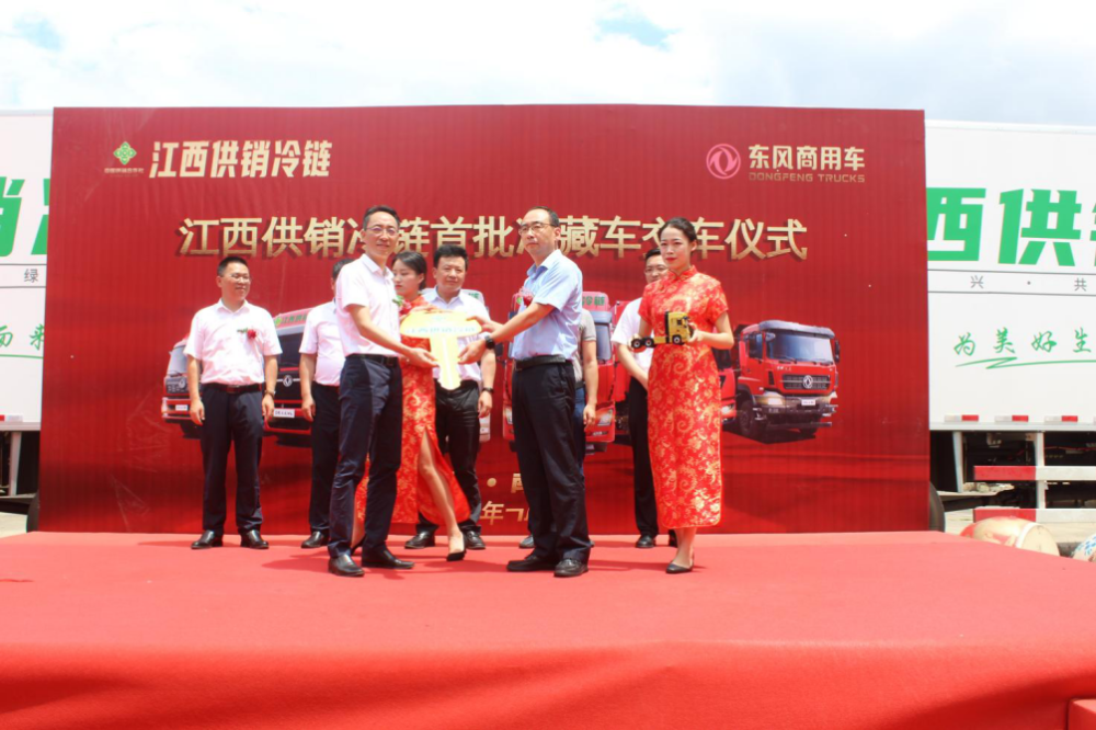 交车现场,20辆打有“江西供销冷链”字号的冷藏车在李晓刚书记及全体嘉宾的共同见证下顺利交付。据悉,该批冷藏车由东风商用车有限公司生产,具备超强动力、超低油耗、超高可靠等优势。首批20辆冷藏车的交付使用,是省供销冷链公司布局冷链物流产业,构建全省城乡冷链物流骨干网,助力乡村振兴的重要举措,标志着全省农产品冷链物流产业发展向前迈出一大步。